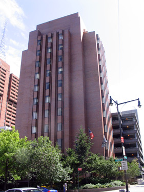 The eleven-storey brown brick tower has the plan of a Greek cross, built outward in four stages. A square core is held at its corners by wide piers, which rise to almost the full height of the building. Between the piers on each side protrudes a nine-storey rectangular block, its base overhanging the entrance and lobby, its top stopping short of the piers’ tops, producing at the summit a series of setbacks like those of a classic skyscraper. On the face of each extruded block is a bank of five raised vertical ribs, with narrow, shadow-laden valleys between them. Three of these carry window-bays; the other two are blind brick. (The thin and long glazed bricks used show Johnson’s continued preference for elegant materials.)